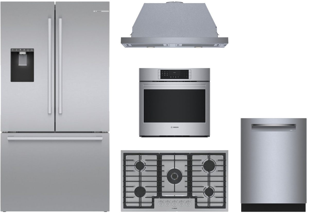 Bosch 5 Piece Stainless Steel Kitchen Package with French door refrigerator, built in dishwasher, single electric wall oven, gas cooktop and under cabinet range hood.Read More