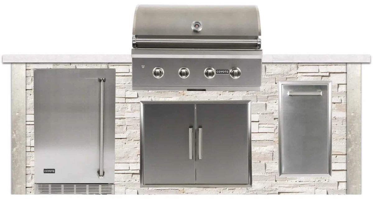 This BBQ grill island includes a Coyote 36″ C-Series Built-In Grill available in either natural gas or propane (sold separately).