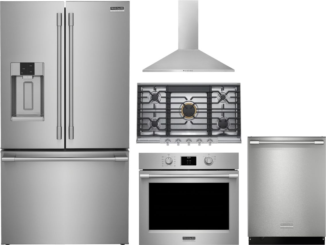 Frigidaire Professional® 5 Piece Stainless Steel Kitchen Package with a French Door Refrigerator, Built In Dishwasher, Single Electric Wall Oven, Gas Cooktop, and Wall Mounted Range Hood.Read More