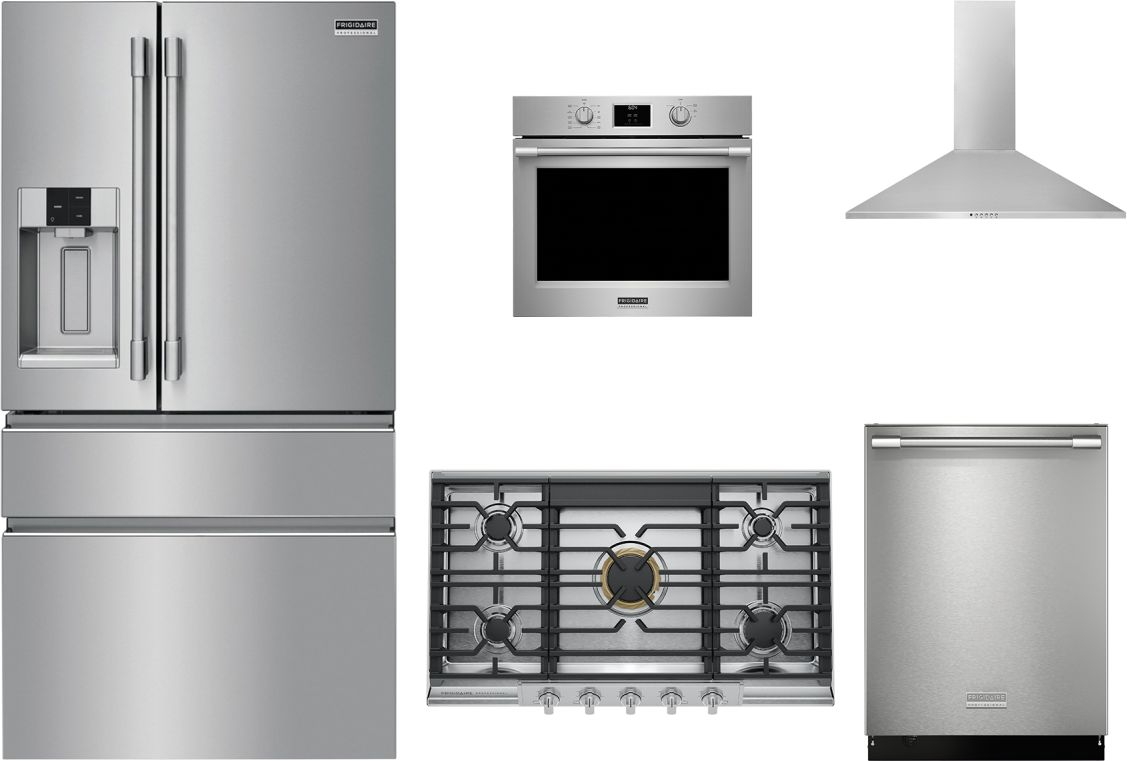 Frigidaire Professional® 5 Piece Stainless Steel Kitchen Package with a French Door Refrigerator, Built In Dishwasher, Single Electric Wall Oven, Gas Cooktop, and Wall Mounted Range Hood.Read More