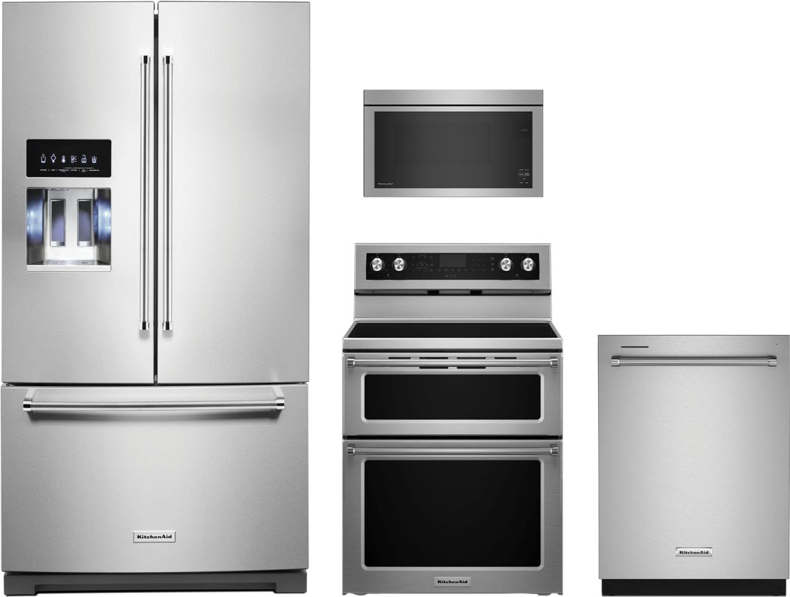 KitchenAid® 4 Piece Stainless Steel Kitchen Package with a French door refrigerator, freestanding electric double oven range, over the range microwave and built in dishwasher.Read More