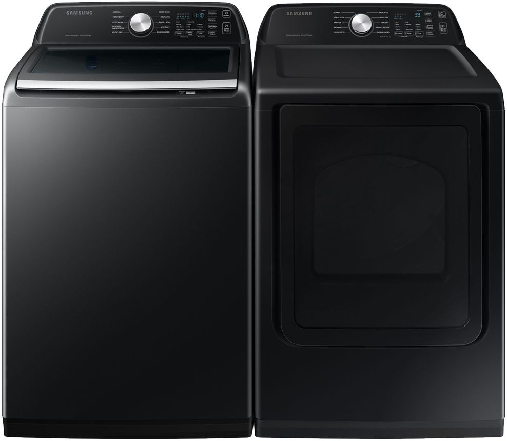 Samsung Brushed Black Laundry Pair with a 4.7 cu. ft. capacity top load washer and a 7.4 cu. ft. capacity front load gas dryer.Read More