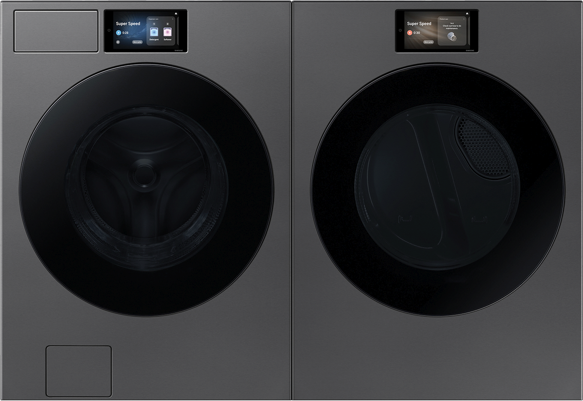 Samsung Bespoke AI 7.6 Cu. Ft. Dark Steel Front Load Gas Dryer with AI Home & AI Optimal Dry. The brand new design is simplified and seamless, with a large 7” LCD display. Its elegant flat front and back fit harmoniously with other appliances and furniture. And you can install a washer and dryer together either horizontally or vertically.