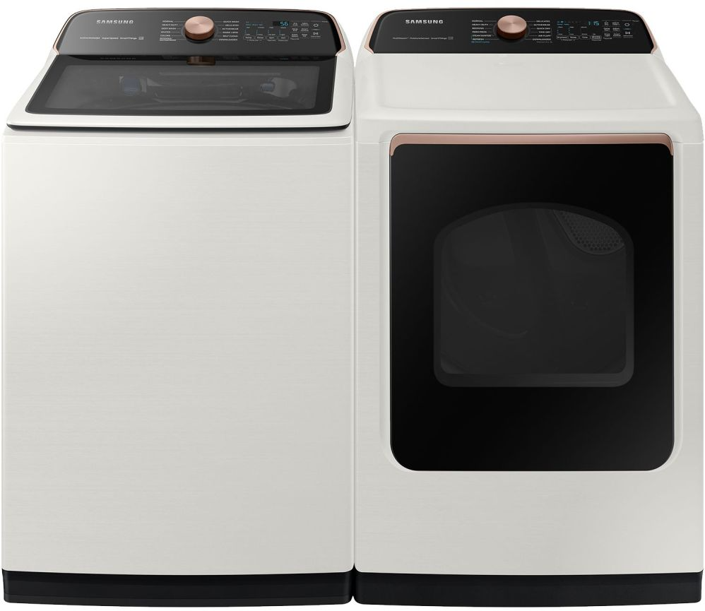 Samsung Ivory Laundry Pair with a 5.5 cu. ft. capacity top load washer and a 7.4 cu. ft. capacity front load electric dryer.Read More