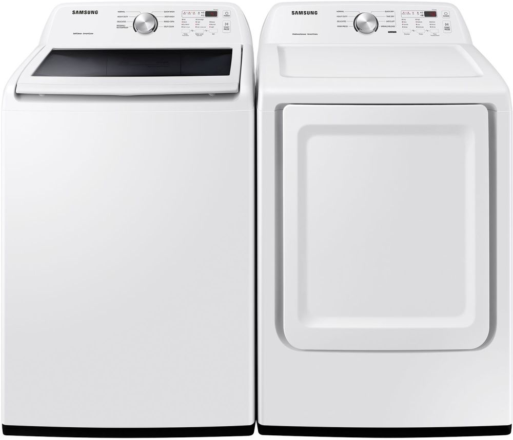 Samsung White Laundry Pair with a 4.4 cu. ft. capacity top load washer and a 7.2 cu. ft. capacity front load gas dryer.Read More