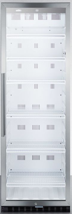SUMMIT's commercially approved beverage merchandisers are designed for durable service, convenient use, and attractive presentation. SUMMIT SCR1400W offers 12.6 cu.ft. of storage space in a slim-fitting footprint just under 24". Bottles and cans can be stored on six heavy duty wire shelves, with fifteen glide options to accommodate different sizes. LED lighting offers full illumination of stored products and a digital thermostat makes temperature control as simple as touching a button. The readout can be viewed in Celsius or Fahrenheit. The frost-free SCR1400W features a tempered heat-safe glass door trimmed in stainless steel, with a keyed lock for added security. The stainless steel trimmed glass door includes a pro style handle to complete the modern look, with a self-closing mechanism to ensure items aren't accidentally exposed to warm air. This unit has a right hand door swing. For a left hand version, see the SCR1400WLH. This model has a white cabinet and a right angle plug for an easier fit. It meets UL-471 commercial standards and is ETL-S listed to NSF standards for use in any commercial foodservice establishment. For this same unit with a stainless steel exterior, see the SCR1400WCSS. NOTE: This is an indoor refrigerator and is not designed for use in the outdoors.