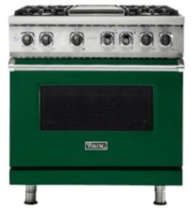 The Viking® Ivy 36" Self-Cleaning Dual Fuel Range with Griddle combines luxury and performance. Featuring a spacious gas cooktop, an self-cleaning oven, and a built-in griddle, it offers precise cooking control and a stylish antique bronze finish for any kitchen.Read More