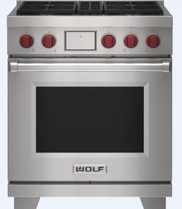 Wolf® 30" Stainless Steel Freestanding Dual Fuel Range features dual-stacked, sealed burners, Wolf’s Dual VertiFlow™ convection system, Gourmet Mode, 10 chef-created cooking modes, LED backlit control bezels, and a full-color touchscreen.Read More